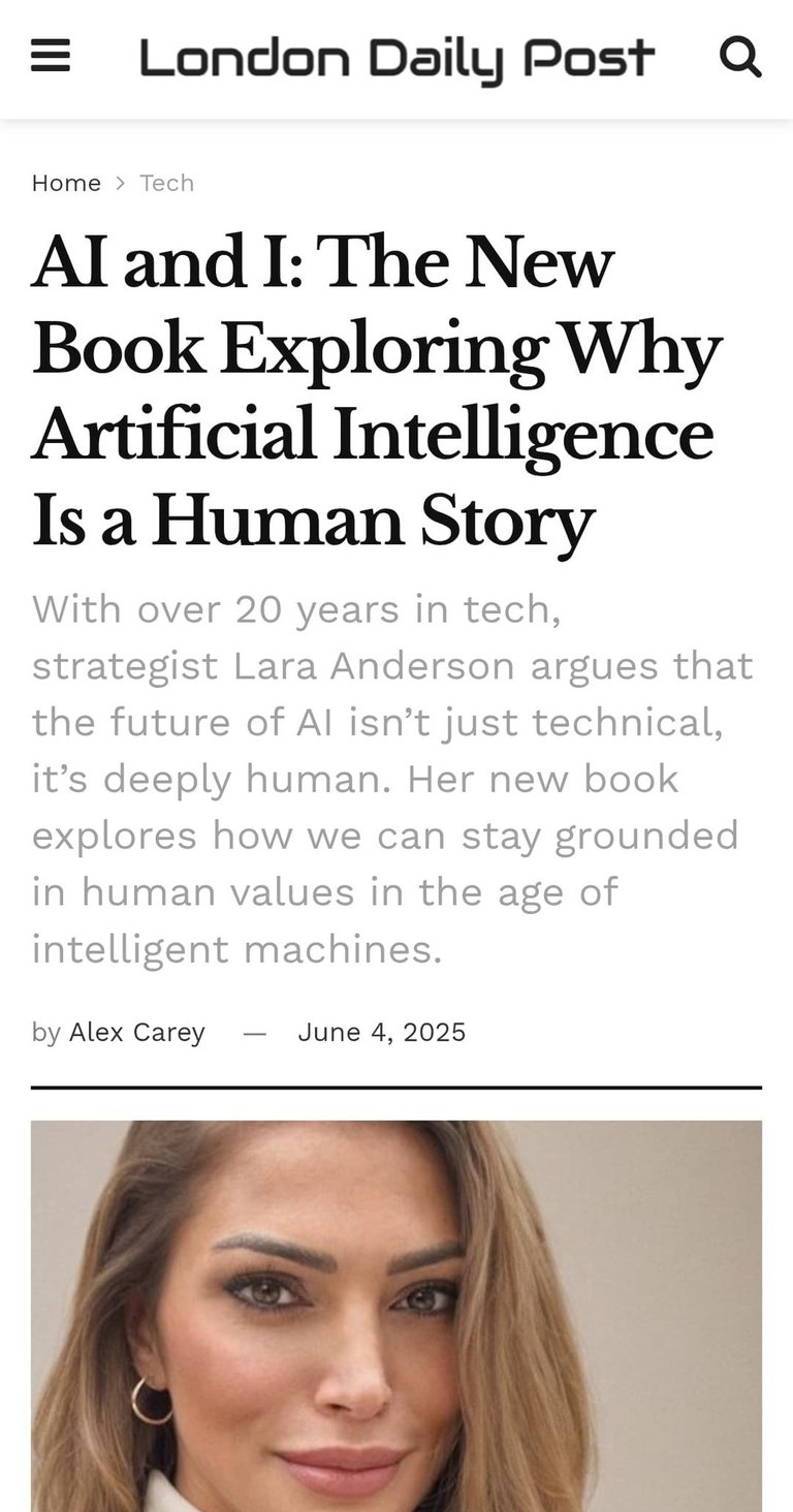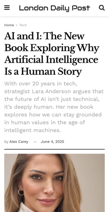 In this standout feature from the London Daily Post, Lara Anderson reflects on the thinking behind her debut book AI & I, and why she believes artificial intelligence should be approached as a human story, not just a technological one. The article offers a clear, accessible introduction to the book’s central themes, including how AI is shaping the way we live, work, and relate to one another. It’s a thoughtful look at why understanding AI today requires more than just technical know-how.